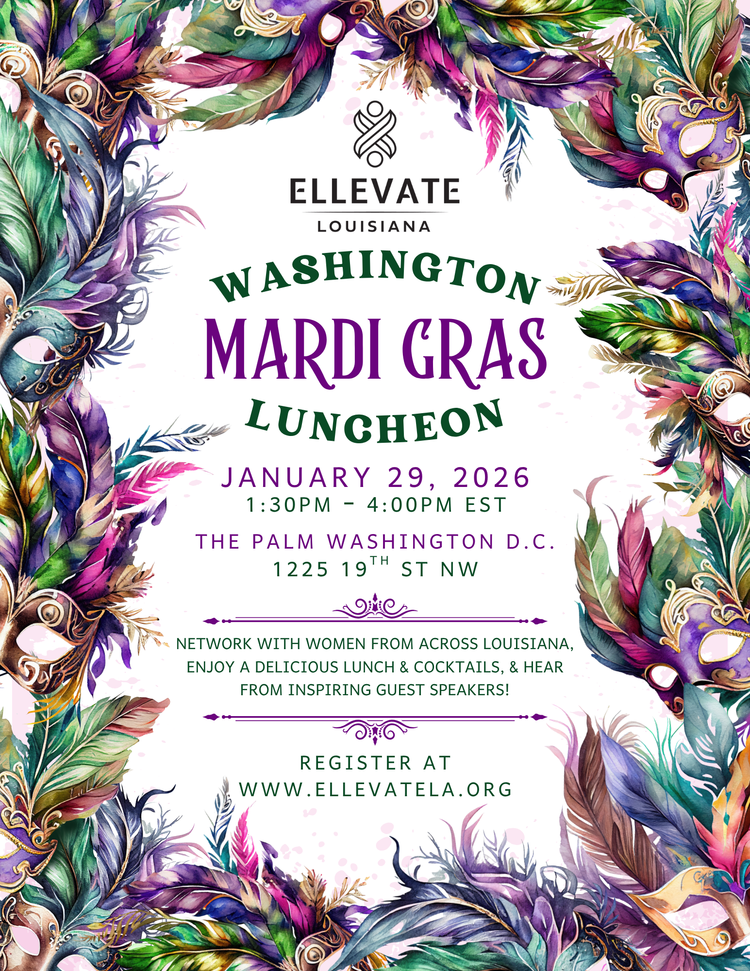 Don't miss this unique opportunity to network, share ideas, and make lasting memories. Get your tickets now and join us for an unforgettable Mardi Gras experience with Ellevate LA!