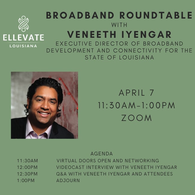 Join Ellevate Louisiana for a roundtable discussion on broadband issues ahead of the legislative session with Veneeth Iyengar, the First Incoming Executive Director of Broadband Development and Connectivity for the State of Louisiana